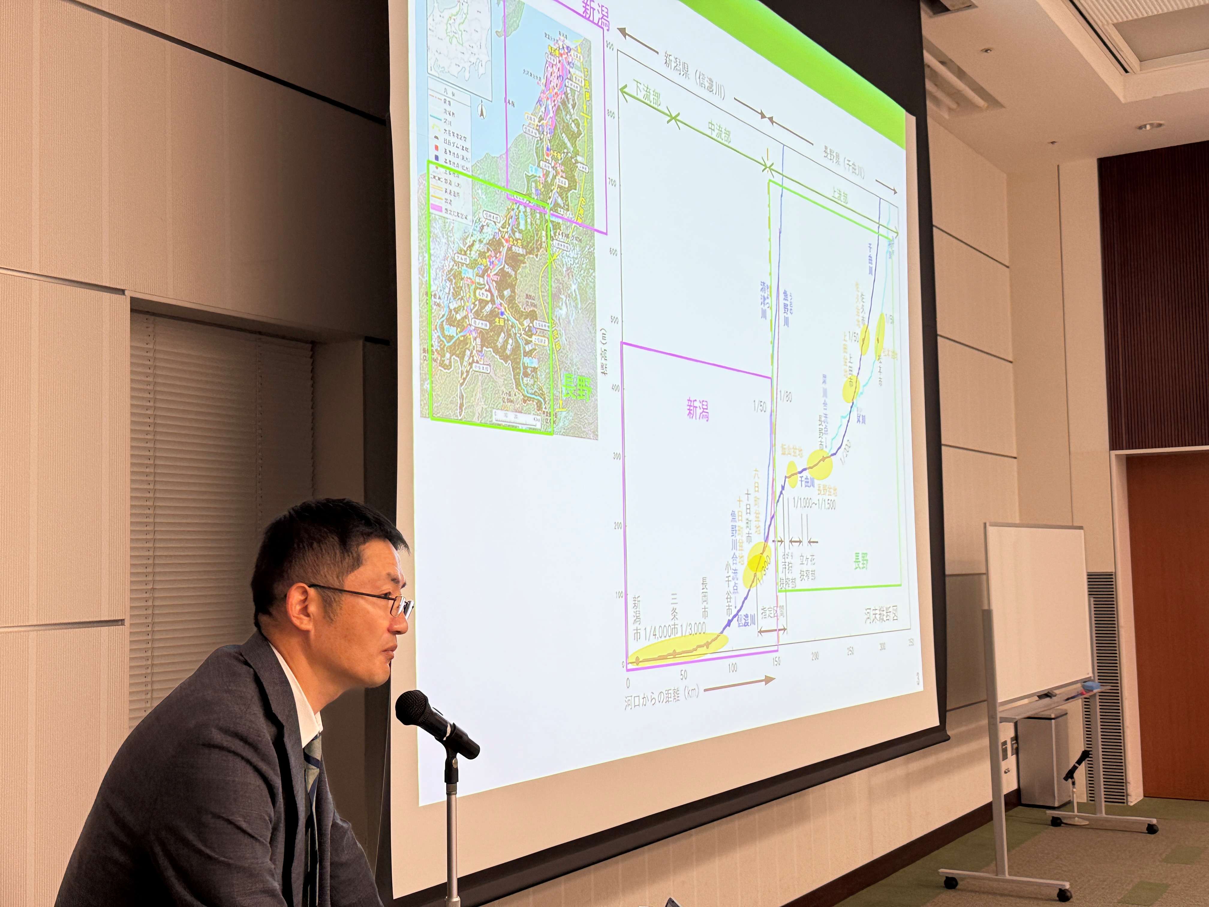 ![]() 講演「大河津分水路「令和の大改修」事業について」 国土交通省北陸地方整備局信濃川河川事務所長 土屋 修一氏の講演の様子 |