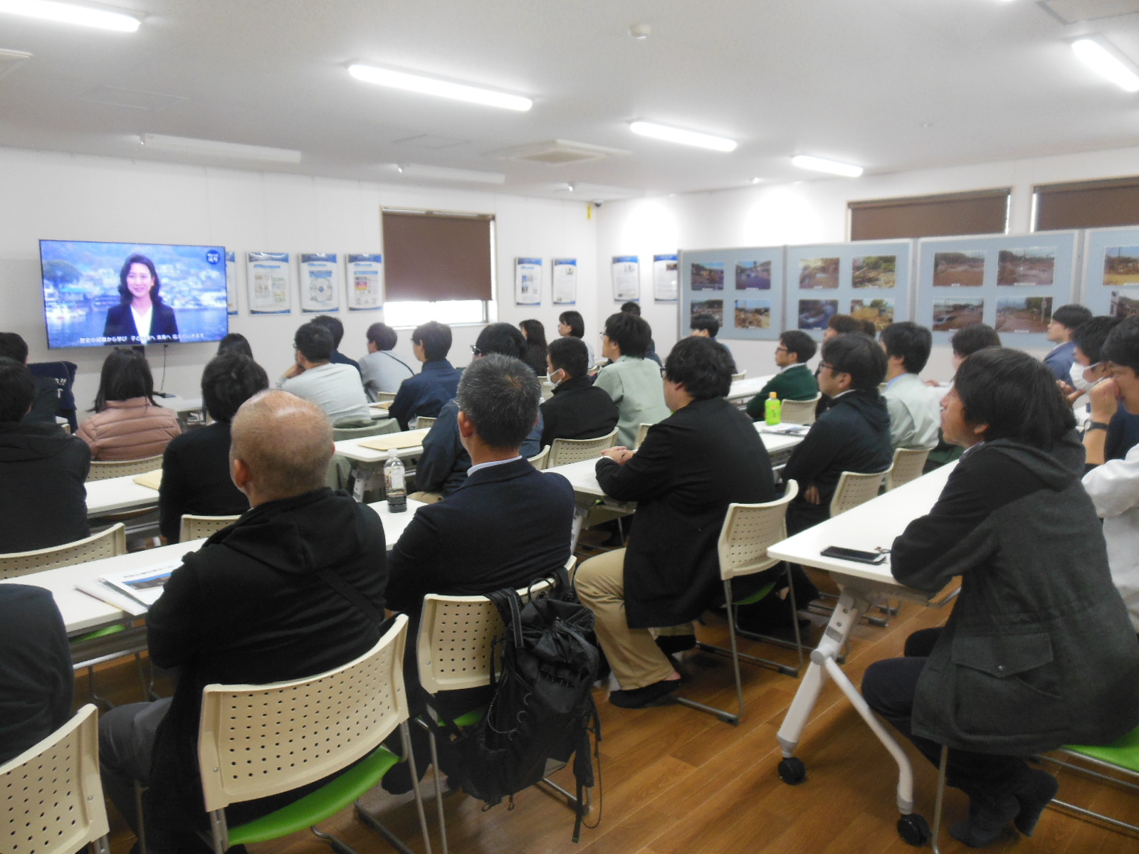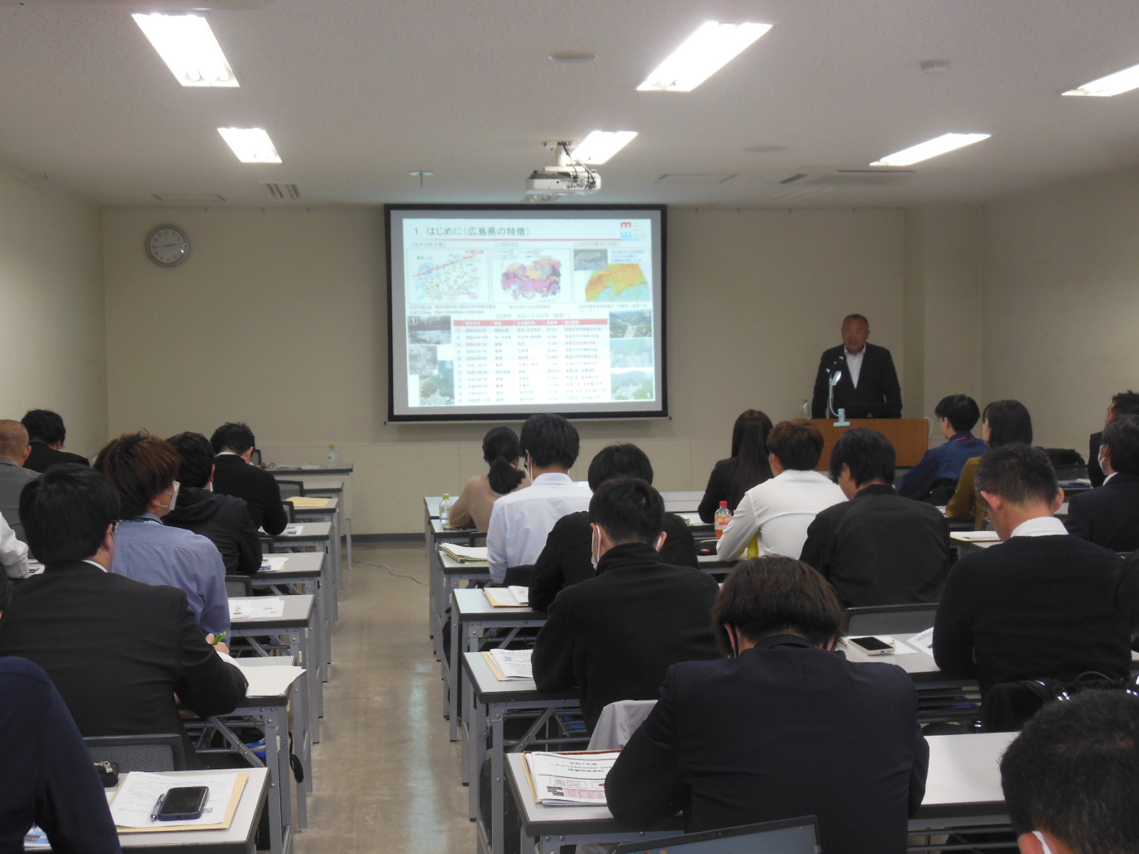 ![]() 講演「平成30年7月豪雨災害等の復旧・復興について」 広島県西部建設事務所安芸太田支所技術次長 新田 勉氏の聴講の様子 |
