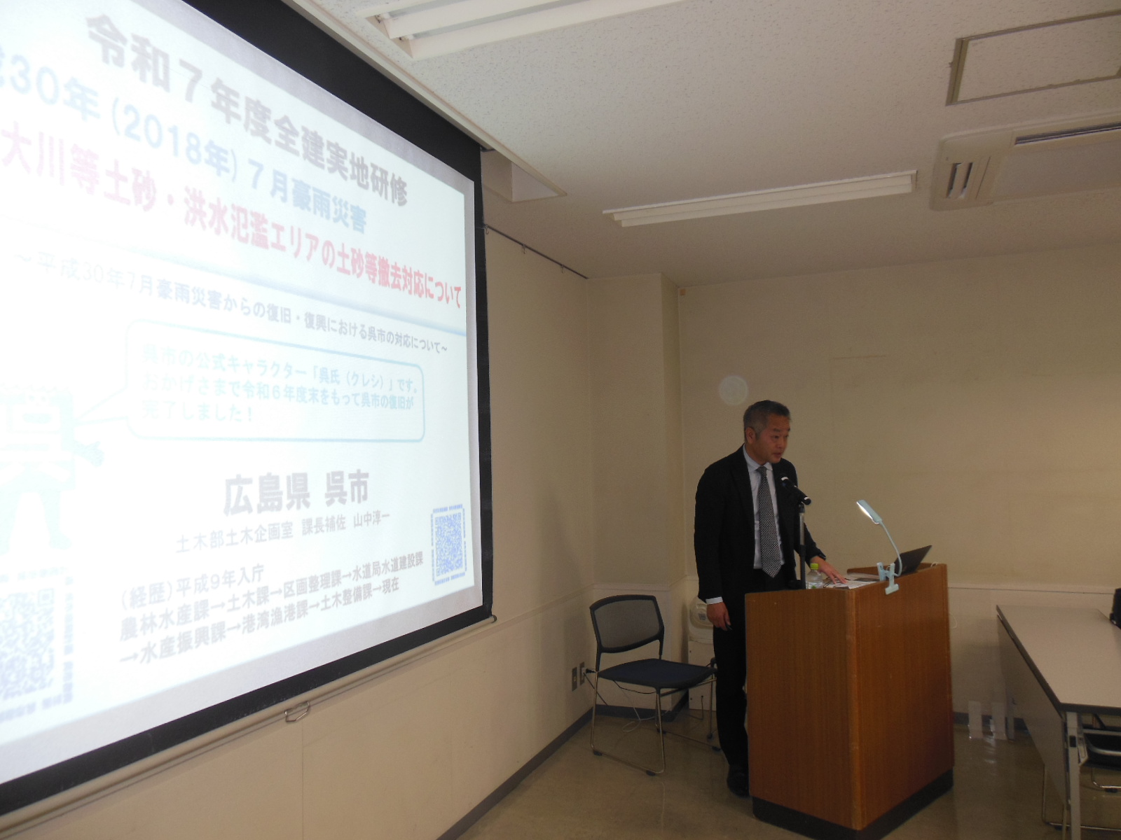 ![]() 講演「平成30年7月豪雨災害後の対応について」 呉市土木部土木企画室課長補佐 山中 淳一氏の講演の様子 |