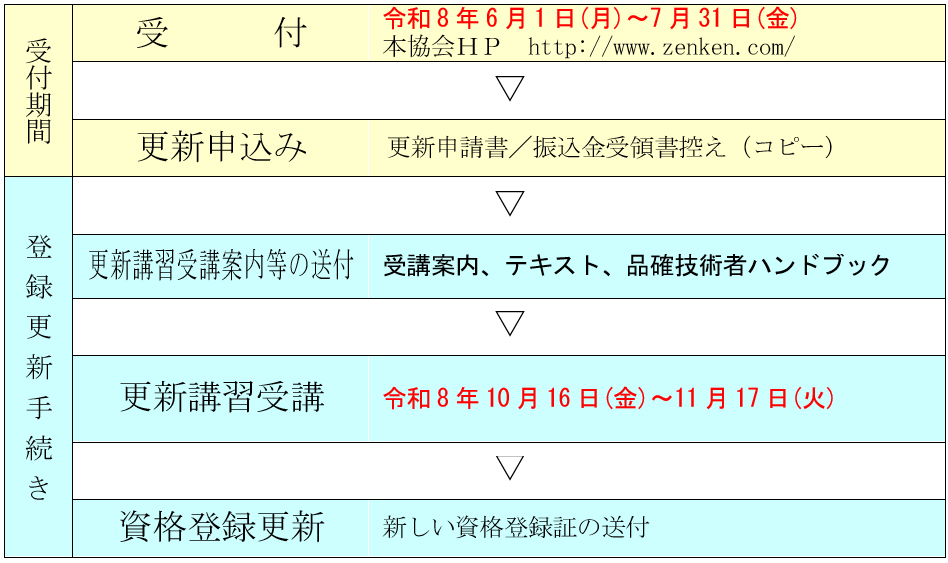 ![]() ■申請書受付期間〈当日消印有効〉 令和8年6月1日(月)〜7月31日(金) ■資格区分 公共工事品質確保技術者(T)、(U) ■対象者 @令和5年度の合格者で登録申請手続きを済ませた者 A令和5年度に登録更新手続きを済ませた者及び令和6年度に再登録した者 (@A共に、令和9年3月31日に登録有効期間が満了する者) B令和8年3月31日で登録有効期間が満了した者(再登録対象者) ※対象者には、5月末までに登録更新申請用紙を送付します。 ■受講料・登録更新手数料について 受講料・登録更新手数料 22,000円(消費税込み、テキスト代含む) 〔内訳:受講料 15,000円、登録更新手数料 7,000円〕 ※受講料減額制度あり(登録更新の手引き:参照) ■申請方法 電子メール(郵便も可) ■登録更新の手引き等 ※右クリックで〈対象をファイルに保存〉等でダウンロードしてください ■講習方式について WEB研修【ビデオ方式】 事前に収録した動画を任意の時間に視聴する方式 ■受講案内等の送付について 受講者には、10月上旬からテキスト及び受講案内の発送を開始します。 お手元に届かない場合には、事務局まで確認してください。 ■動画視聴確認について